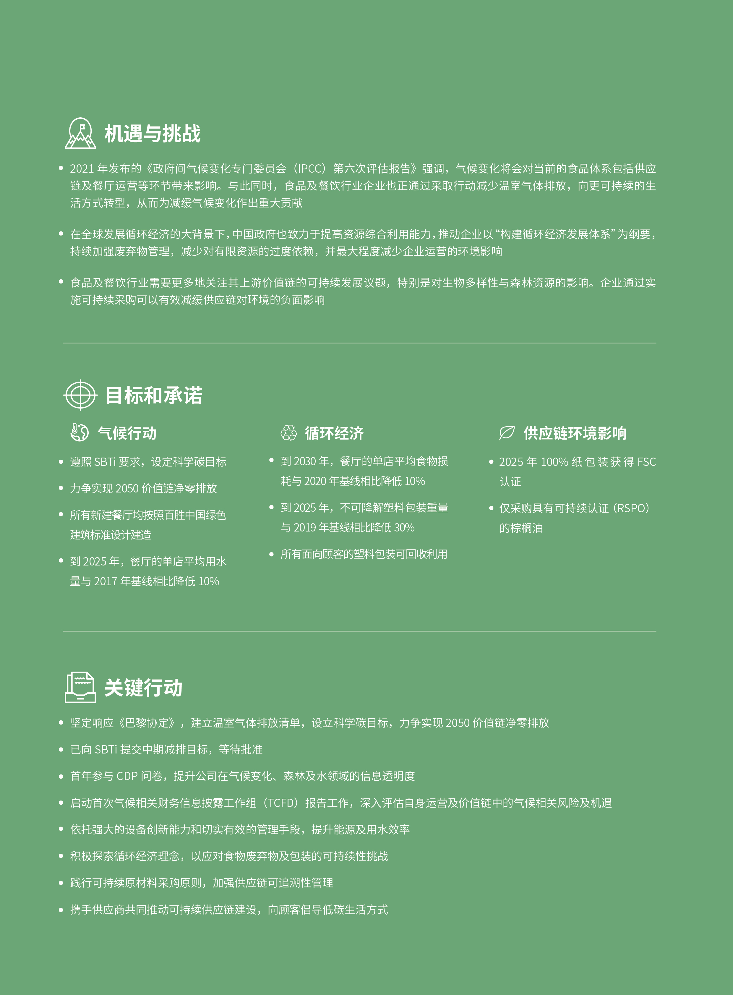 加强气候行动正成为全球不同国家、行业和企业共同面临的挑战。百胜中国坚守绿色承诺,在保障全国超过一万家餐厅正常运营的同时,始终致力于持续减少自身运营和价值链上下游活动所带来的环境足迹。我们以“力争实现2050净零排放”和“供应链零毁林”为目标,持续打造绿色餐厅,推动供应商低碳转型和负责任的原料采购,倡导可持续生活方式。我们也以循环经济理念为驱动,加强废弃物管理与资源化利用,开发可持续包装创新解决方案,持续探索餐饮行业绿色、可持续消费模式。未来,我们将继续携手价值链上的各利益相关方,推动产业变革,化挑战为机遇,共同守护我们赖以生存的地球家园。